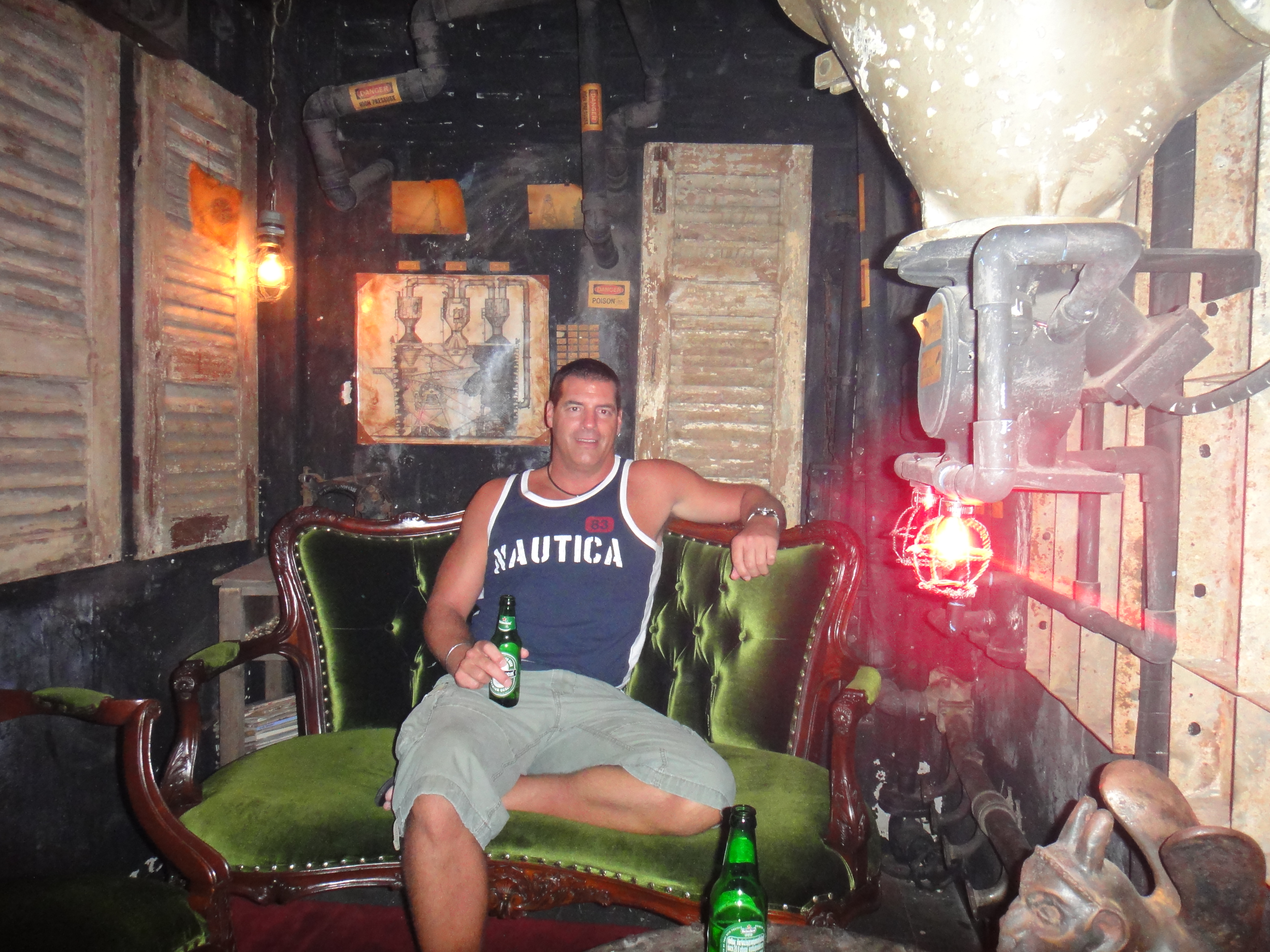 We went to a bar called the Iron Fairies. Probably the coolest bar I’ve ever seen! It’s run by an Australian who wrote some children’s books about fairies, and then started a blacksmith shop here making castings of little fairies out of iron. He apparently has his retail shop and another similar bar in New York (www.theironfairies.com – some decent pics of the bar in the gallery section of the website). The back part of the building is his blacksmith shop, so the place kind of has the smell of a foundry. The interior is tough to describe, and pictures do it no justice. It’s small, but crammed with all kinds of random things like old sewing machines, metal-working and foundry tools and equipment, tricycles hanging on the walls. From an aesthetic standpoint, I’d have to say it’s a cross between industrial steam punk and Harry Potter. The attention to detail is mind-boggingly unbelievable – you could spend days in the place and still never pick up on all the little things he’s done. It’s dimly-lit, mostly by candles and some small lightbulbs, has stairs going to nowhere, and hidden rooms behind bookshelves. If you’re ever in Bangkok, this is an absolute must-see.