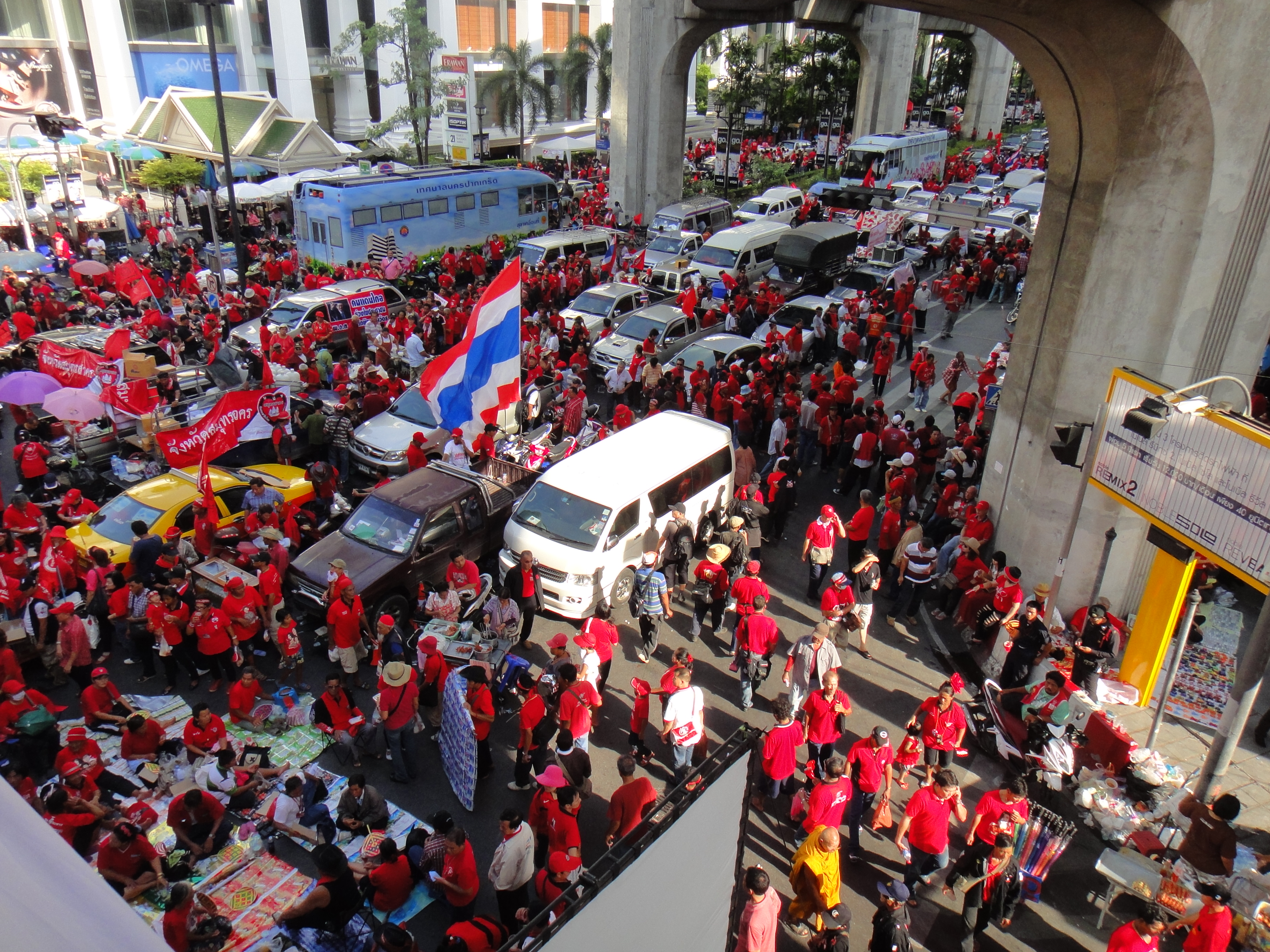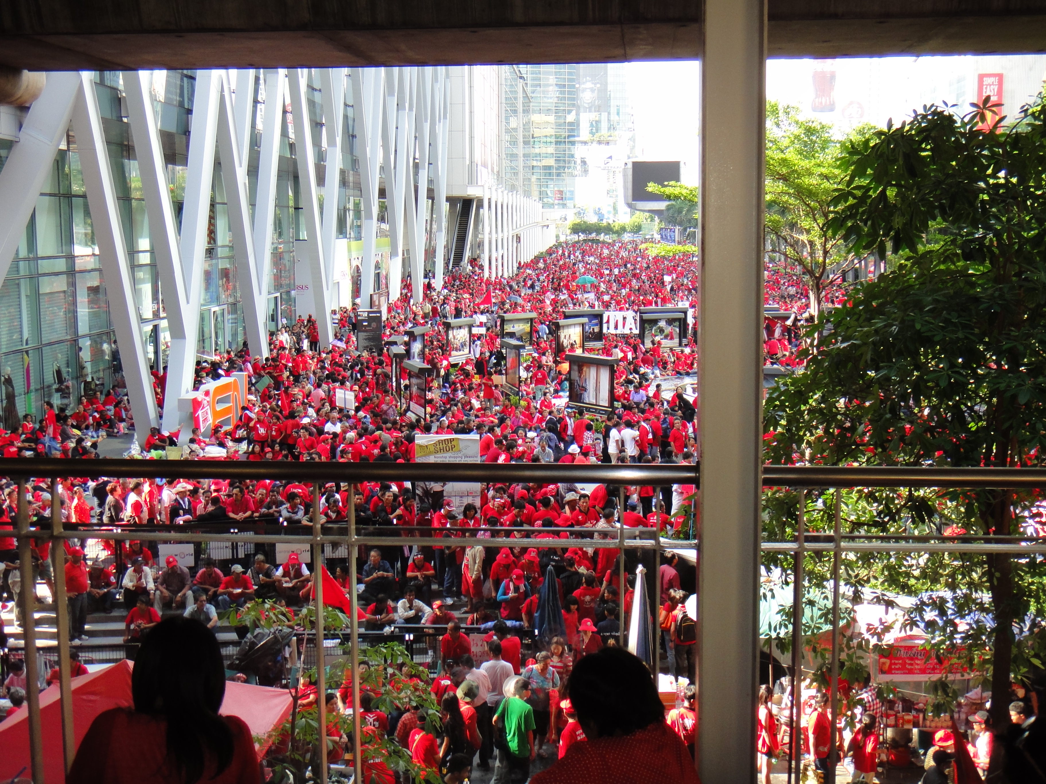 One day I was going to a store and didn’t realize there was a huge red shirt rally going on. It was to mark the 2-year anniversary of another rally that turned violent and several people were killed. I got off the Skytrain and began walking, and was soon engulfed in a sea of tens of thousands of people wearing red shirts. They were having their rally in a large plaza next to one of the malls, and overflowed into several blocks of streets surrounding it. I was walking along an elevated walkway so I could see down to the streets below, and it was mind-boggling to look out over a sea of red in all directions. The mall and several stores that I had planned to go to that day were closed because of the rally, so it kind of ruined my plans but it was far more interesting to witness that instead of doing the little shopping trip I had planned.