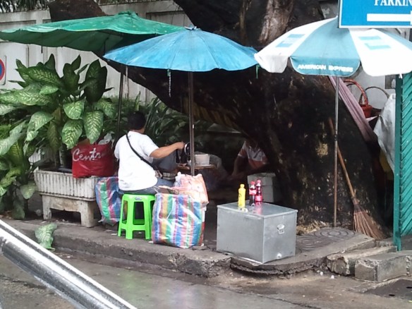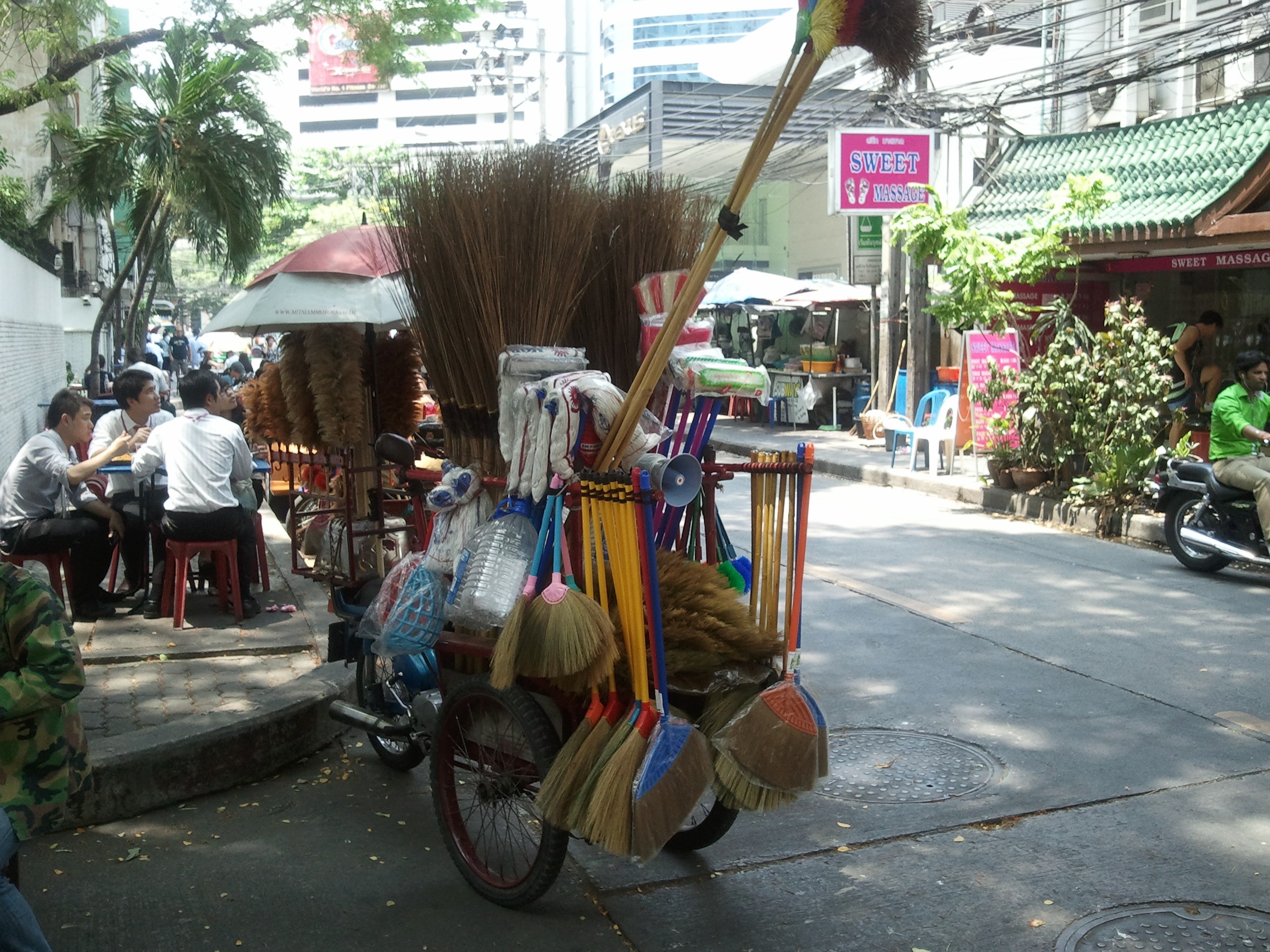 It’s amazing how much “mobile commerce” actually happens on the streets of Bangkok. Most well-known, of course, are the food carts but there’s far more than that. There were several carts I saw that were basically a motorcycle where the front part was cut off and a cart welded onto it. One cart drove around selling handmade brooms, dusters and dust pans (which frankly work better than any fancy Western broom you’ve ever used). Another cart was selling all kinds of plastic bowls, spoons, stools and chairs – exactly the same things being used by all the street food vendors. A street food cart vendor doesn’t need a lot of supplies, but the few that they do need are peddled to them by other vendors – genius!