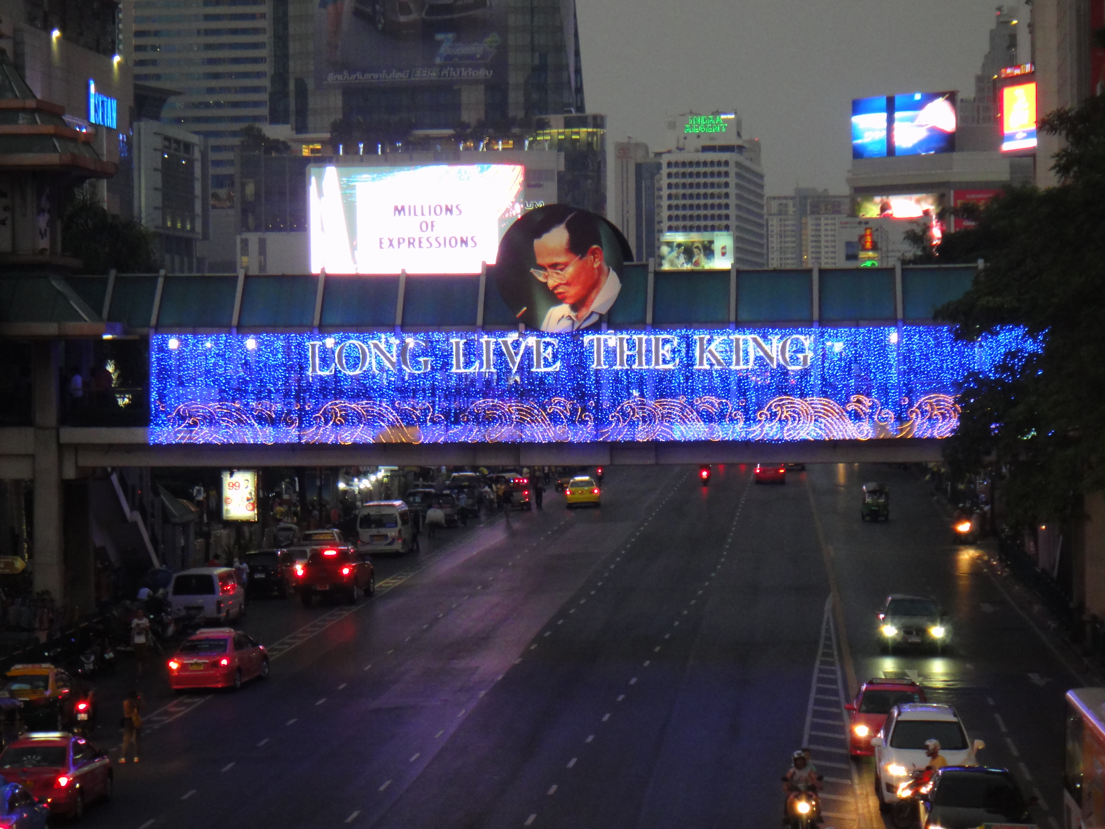 King’s Birthday Published December 11, 2012 at 3648 × 2736 in Loy Krathong and the King’s Birthday Lighted “Long Live the King” banner on a skywalk across a city street