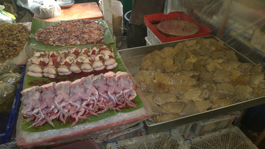 WP_20150124_010 Published May 4, 2015 at 3072 × 1728 in Bangkok Wet Market and “Cooking with Poo”! Live frogs on the right, less live on the left. The middle row of frogs are alive, but have their hearts pulled out of their chests.