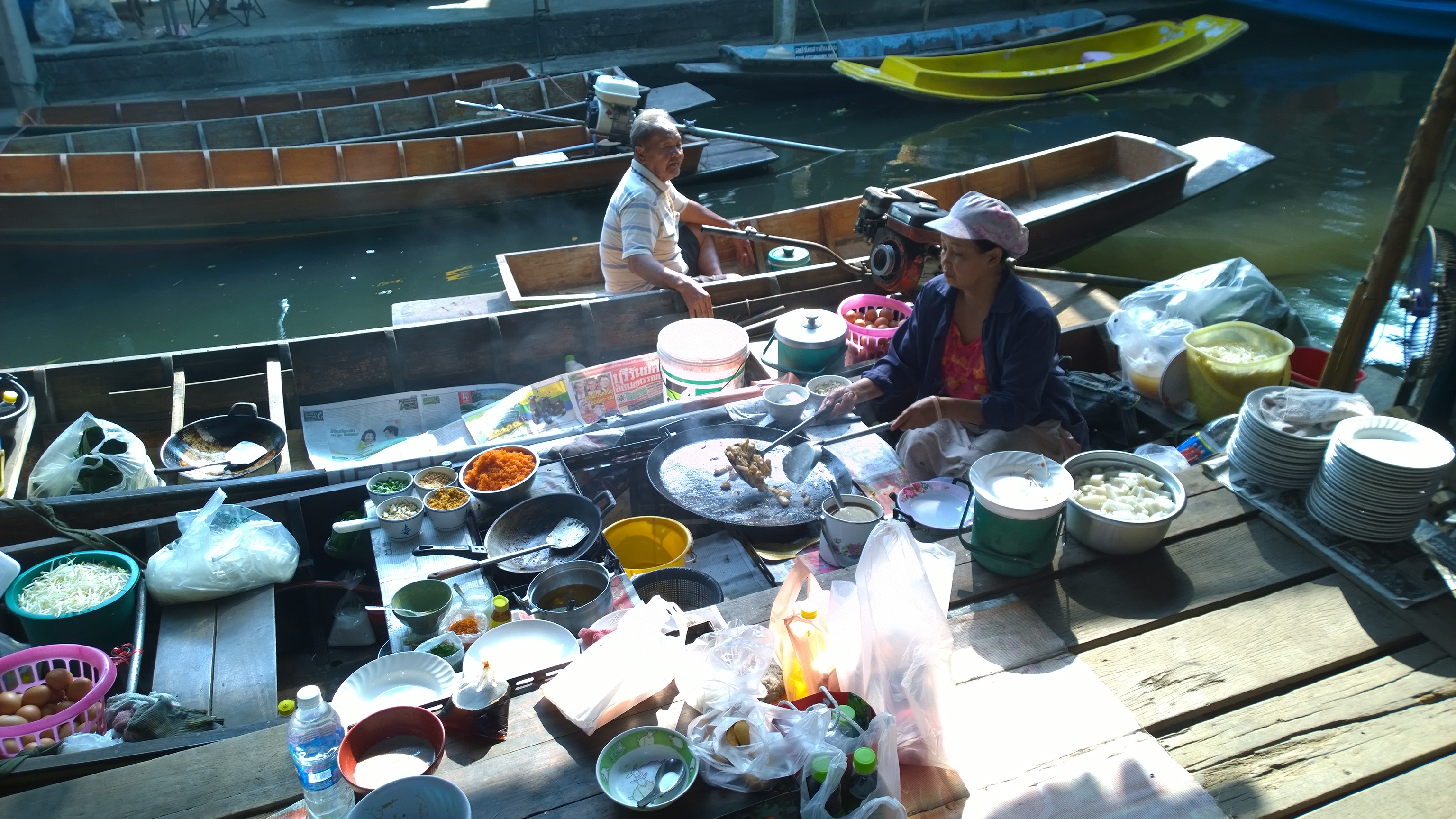 WP_20150208_036 Published May 16, 2015 at 3072 × 1728 in Bangkok Bicycle Tour Women on boats cooking food