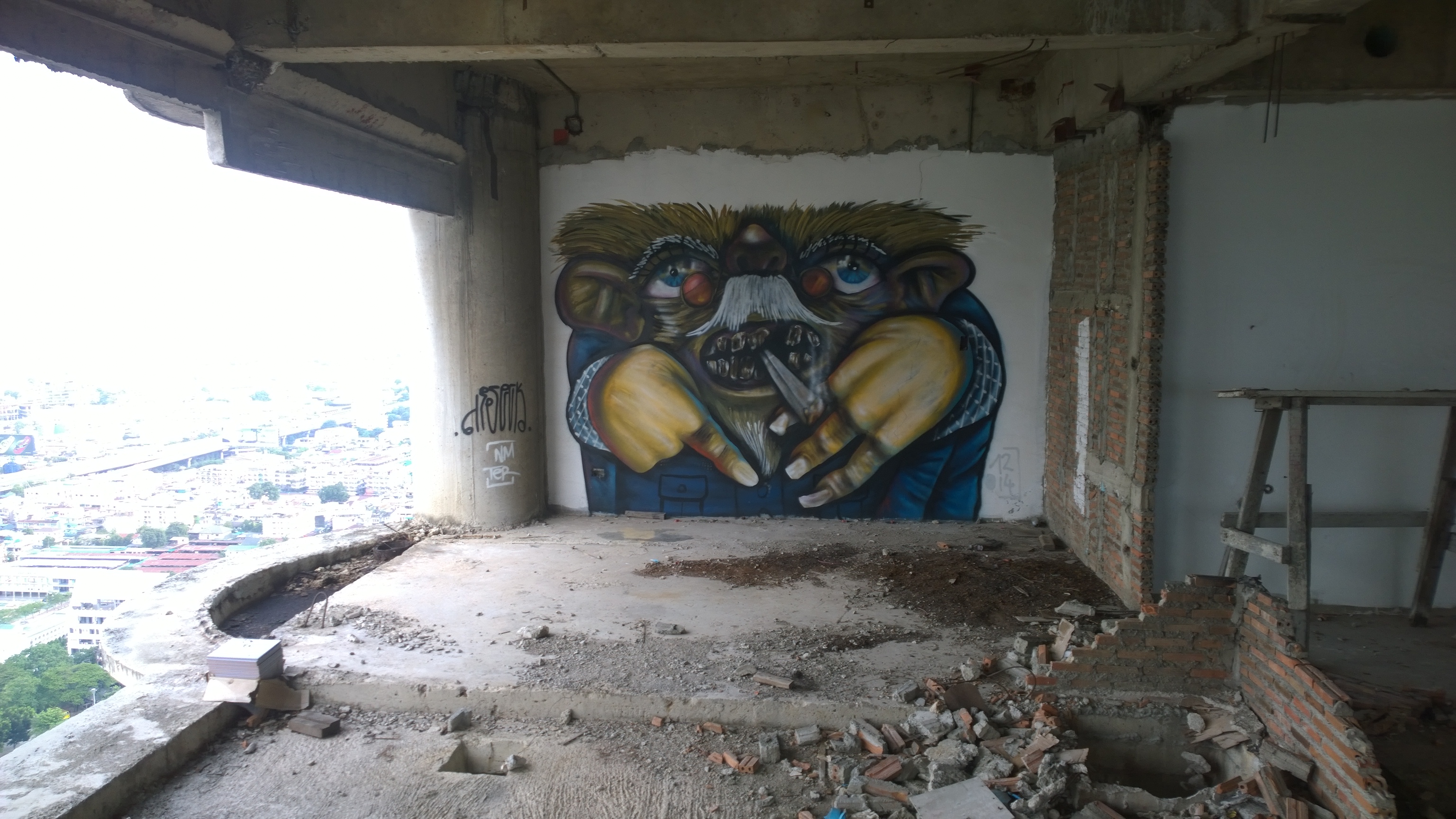 WP_20150411_006 Published May 15, 2015 at 3072 × 1728 in Exploring the “Bangkok Ghost Tower” One of many murals/graffiti in the building